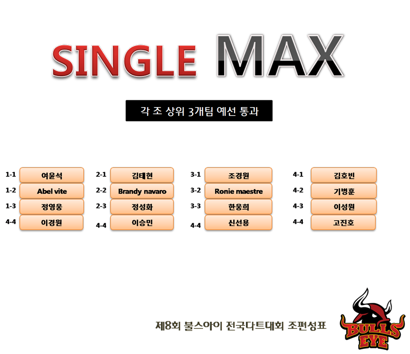 안내 | 제8회 전국다트대회 조편성표 페이지 정보 작성자 불스아이 작성일2018-10-19 이전글 다음글 본문 일요일 오전 9시부터 엔트리 확인을 하면서 신청서에 사인을 받습니다. 반드시 본인 신분증을 지참하셔야 합니다~ 목록